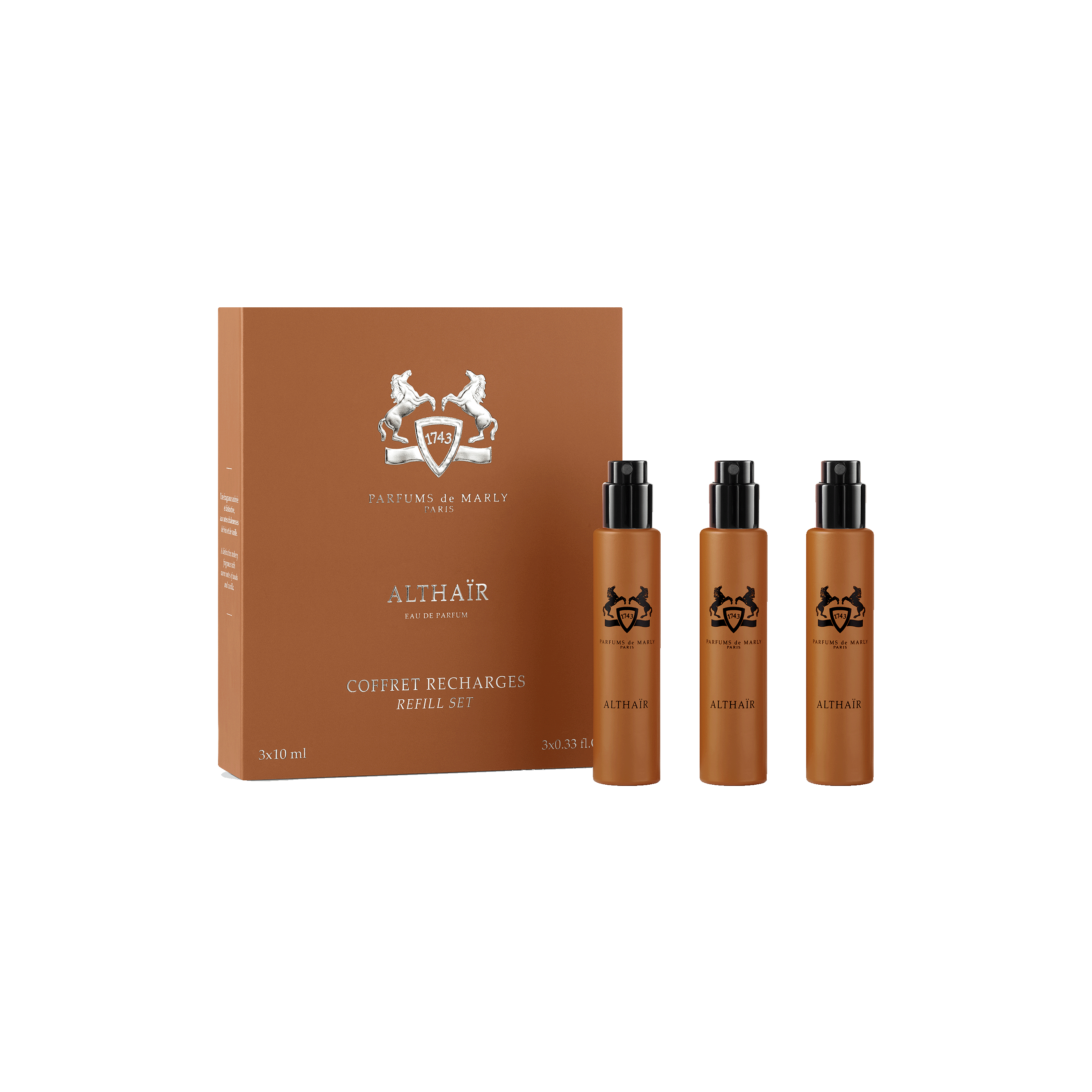 Althaïr vereint die Sanftheit der Vanille, den Genuss von Praliné und das Leuchten der Orangenblüte. Ein unverwechselbarer Duft: warm, elegant und charismatisch. Das Althaïr-Nachfüllset erweitert auf elegante Weise die Kunst der Parfümerie. Es enthält drei 10 ml-Nachfüllflaschen, die perfekt auf das Reiseetui von Parfums de Marly abgestimmt sind. Eine Kreation, die dem spielerischen und unverwechselbaren Geist des Hauses treu bleibt.