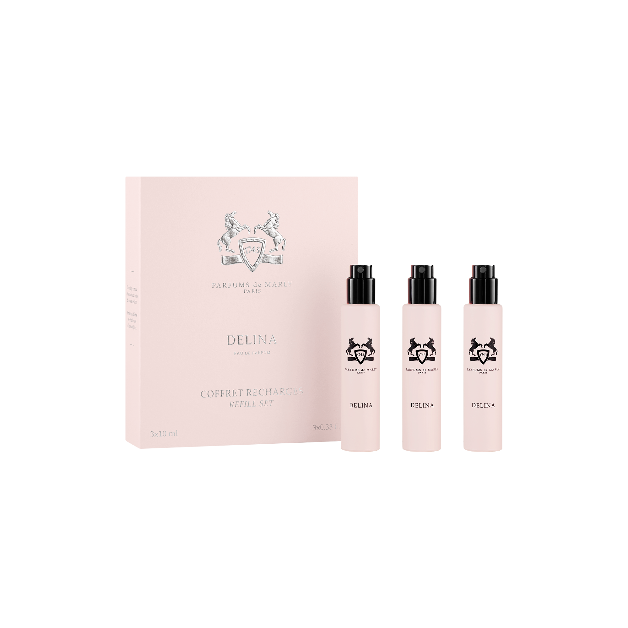 Delina entfaltet zunächst einen Duft nach dynamischem, erfrischendem Rhabarber und süßer, saftiger Litschi, offenbart dann in der Herznote das Aroma der Damaszener Rose und mündet in einen wohltuenden Duft nach zartem Moschus und Cashmeran. Von diesem sinnlichen und wohltuenden Duft kann man einfach nicht genug bekommen. Das Delina Exclusif-Nachfüllset erweitert auf elegante Weise die Kunst der Parfümerie. Es enthält drei 10 ml-Nachfüllflaschen, die perfekt auf das Reiseetui von Parfums de Marly abgestimmt sind. Eine Kreation, die dem spielerischen und unverwechselbaren Geist des Hauses treu bleibt.