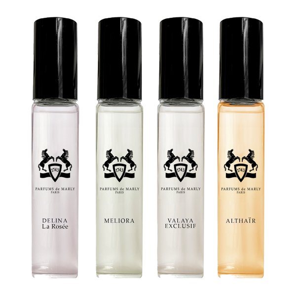- Découverte 4x5ml (Délina La Rosée, Meliora, Valaya Exclusif, Althaïr)offre toute la magie des Parfums de Marly, entre chaleur envoûtante et fraîcheur délicate, entre fleurs et épices, les parfums les plus emblématiques de la Maison s'offrent à vous.