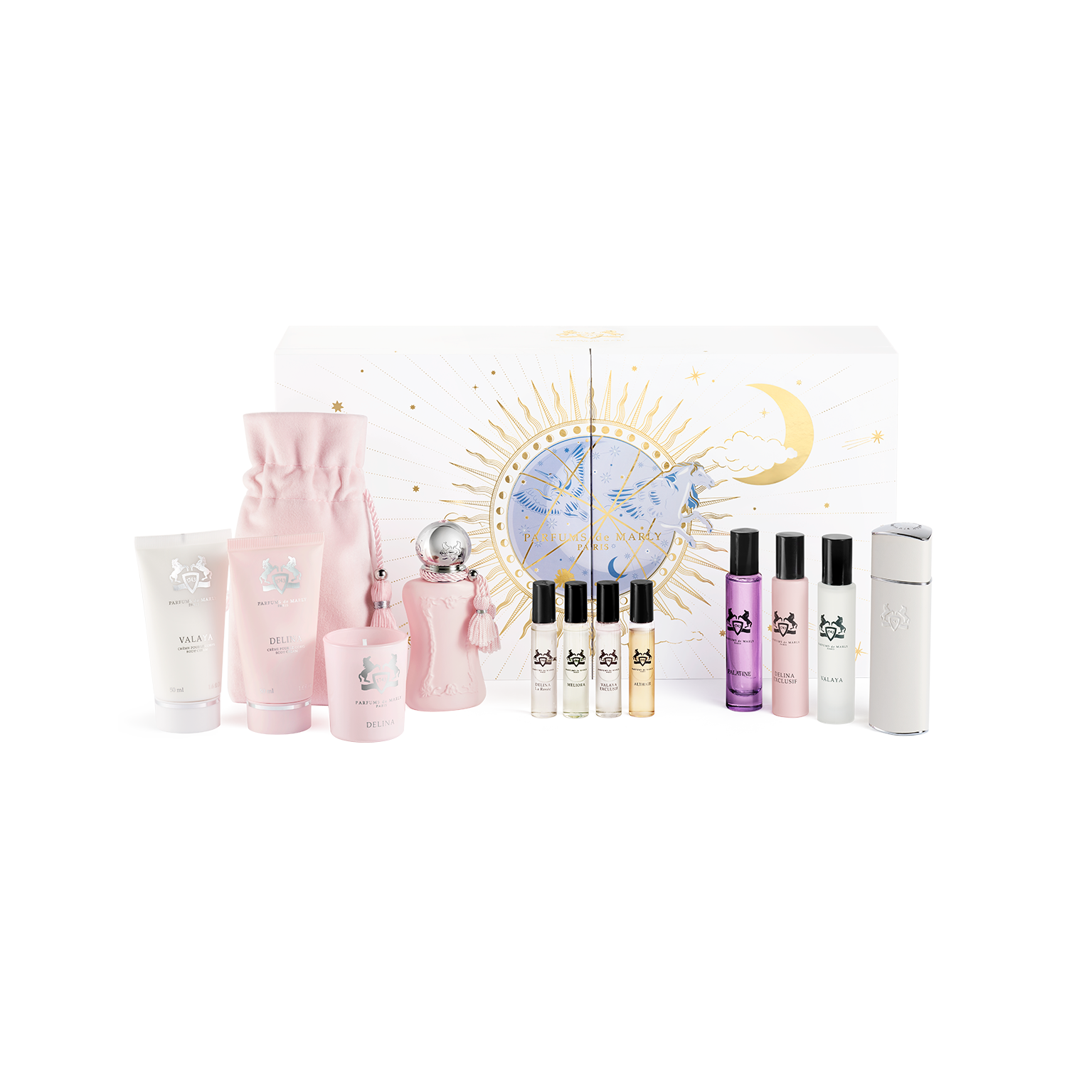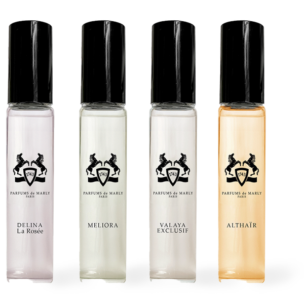- 4x5ml Discovery (Delina La Rosée, Meliora, Valaya Exclusif, Althaïr)- offers the full magic of Parfums de Marly, from captivating warmth to delicate freshness, from florals to spices, the Maison’s most iconic fragrances await you.