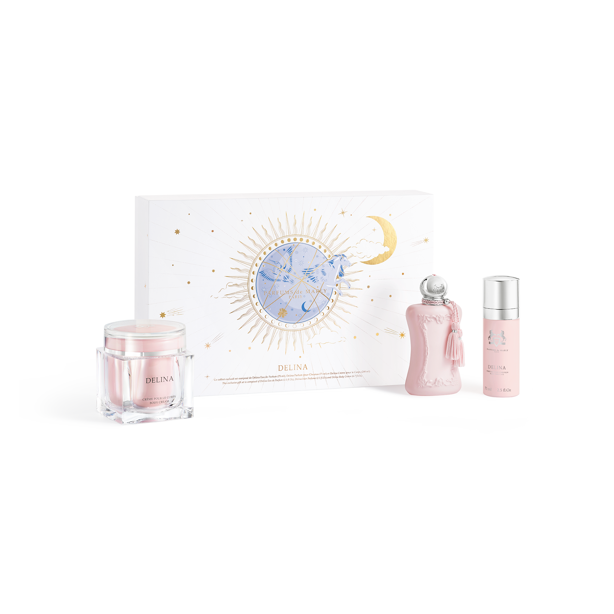 The Maison invites you to experience an enchanting spectacle at the heart of the Château de Marly with this exclusive Delina gift set. Addictive, sensual and generous, Delina opens with a vibrant, sweet and juicy lychee, unfolding into a Damascena rose heart and a trail of soft musks and cashmeran. This gift set contains the most intimate perfumed ritual with a 75ml Delina Eau de parfum, a 75ml Delina hair perfume and a 200ml Delina refillable body cream.